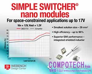2015年2月5日--德州儀器 (TI) 宣佈推出四款全新SIMPLE SWITCHER® 超小型電源模組,這幾款模組重新定義了空間受限應用的電源設計。17 V和5 V模組的特色為在業界最小封裝內提供高效能,而這兩款模組也擴大了TI的SIMPLE SWITCHER模組產品組合,以應對伺服器、工廠自動化、測試和測量,以及網路安全攝影機等 100 ma 至 2 A 的工業設計需要。欲獲得樣品和評估模組相關的更多資訊,敬請參訪 www.ti.com/nanomodules-pr-tw。