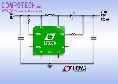2015年3月6日 –凌力爾特 ( Linear Technology Corporation)日前發表電流模式、定頻升壓DC/ DC轉換器 LT8570 及LT8570-1,其中LT8750具備內部500mA、 65V 開關,而 LT8570-1 則具備 250mA、 65V 開關, 兩款元件可操作於 2.55V至40V的輸入電壓範圍,適合輸入源涵蓋單顆鋰電池至汽車輸入之應用。LT8570及 LT8570-1可配置為升壓、SEPIC、或負壓轉換器,而 LT8570-1的小型開關使其可於較低電流應用運用較小的電感。兩款元件均提供200kHz 及 1.5MHz的可編程切換頻率,讓使用者可將外部元件尺寸縮減到最小。結合3mm x 3mm DFN封裝(或MSOP-8E)和精小外部元件,確保了非常精小的接腳佔位,同時可降低解決方案成本。