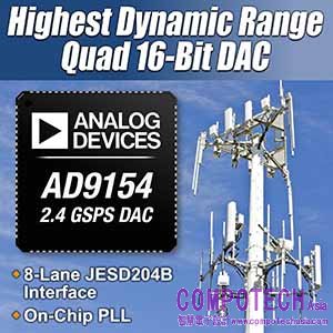 2015年3月31日--全球高效能信號處理解決方案領導廠商Analog Devices(簡稱ADI)美商亞德諾半導體公司,今天推出一款在100 MHz至300 MHz頻段內具有領先業界動態範圍效能的四通道、2.4 GSPS、16位元D / A轉換器,適用於複中頻發射器。高整合型AD9154四通道、16位元D / A轉換器是同類產品中唯一晶片內建鎖相迴路和八通道JESD204B介面的元件。此產品特性的組合,允許設計者使用單一元件符合多重載波GSM和LTE發射器針對無線大型基地台、點對點微波無線電、軍用無線電和無線電測試設備的所有需求。這款最新的轉換器整合一系列針對複中頻發射應用最佳化的特性,包含複數位調變、輸入訊號功率檢測以及增益、相位和偏移補償等。觀看最新高速DAC的影片: www/analog.com/AD9154video
