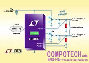 LTC3887 可調節兩個獨立的輸出,或可針對兩個相位單一輸出而加以配置。達 6個相位可交叉和並聯,以於多個 IC之間精準分享,而能針對高電流和/或多個輸出應用將輸入和輸出濾波要求降至最低。內建的放大器提供真正的差動遠端輸出電壓感測,因此可以達到高度精準的穩壓,而其可獨立於板IR壓降之外。應用範圍包括於電訊、資通訊、運算和儲存市場的大電流 ASIC、FPGA和處理器。