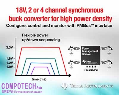 2015年4月1日--德州儀器 (TI) 宣佈推出一款有 PMBus/I2C 數位介面的四通道降壓型 DC/DC 轉換器,適合要在無冷卻系統的情況下忍受很高的工作環境的空間受限型設備中的應用,例如小型蜂巢式基地台、車載資通訊和固態元件等。TPS65400 雙路或四路輸出可配置 DC/DC 轉換器其能整合八個功率 MOSFET,占位面積最小卻具有高達 95% 的效率領先業界。如欲瞭解更多資訊、樣品及評估模組,敬請參訪 www.ti.com/tps65400-pr-tw。
