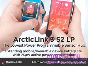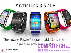 2015年4月10日--超低功耗可編程感應器集線器創新業者QuickLogic Corporation (NASDAQ: QUIK) 今日宣布為其超低功耗可編程感應器集線器系列推出ArcticLink® 3 S2 LP ,新平台具備僅 75uW (68uA @ 1.1V) 的主動功耗,是目前市場上功耗最低的可編程感應器集線器,搭配QuickLogic的延展性SenseMe™演算法資料庫和參考設計,使ArcticLink 3 S2 LP可讓設計人員加入更多特性和功能,並大幅延長智慧型手機和穿戴式裝置的電池壽命。