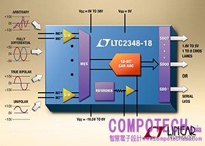 2015年6月11日--凌力爾特 (Linear Technology Corporation) 日前發表 18位元、8通道同步採樣逐次漸進暫存器(SAR)ADC LTC2348-18,元件具有領導業界的性能和彈性,當以每通道200ksps的吞吐量轉換八個通道時,每個SoftSpan™輸入可根據逐步轉換(conversion-by-conversion) 的基礎獨立配置,以接受±10.24V、0V至10.24V、±5.12V或0V至5.12V的訊號。差動類比輸入可操作於寬廣的34V輸入共模範圍,使ADC可直接數位化多種訊號以簡化訊號鏈設計。輸入訊號彈性加上無與倫比的±3LSB最大INL、18位元無缺碼和96.7dB SNR(訊號雜訊比),使LTC2348-18非常適用於高性能工業製程控制、測試和量測、電力線監控、儀器和自動化測試設備應用。