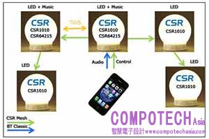為實現系統的低功耗和高穩定性,大聯大詮鼎特別選擇了CSR的藍牙 Mesh和TWS技術和產品。CSR Mesh協定使用藍牙智慧技術將訊號傳輸至其他連接的藍牙智慧,這些藍牙智慧設備再將接收到的訊號傳回。訊號可單獨傳輸給單個設備也可同時傳輸至多個設備,甚至還可傳輸至分屬多組的不同設備。其控制功能借助配備標準智慧藍牙的家用電器,如照明開關或市面上的大多數智慧手機或平板電腦即可實現。為應用在智慧家居環境中,CSR已經將藍牙配置與控制協定預先整合到CSR1010晶片中,且進行複雜安裝、配對,或使用如路由器一樣的接入設備,進而保障完整的使用者體驗。