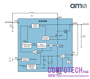 AS1383為準確的線性和負載調節實行峰值電流模式PWM控制,具備帶有極低導通電阻和閘極電荷的內部NMOS和 PMOS電源開關。這幫助轉換器實現高效率,在適度到滿載的負載範圍內,效率峰值可高達92%。