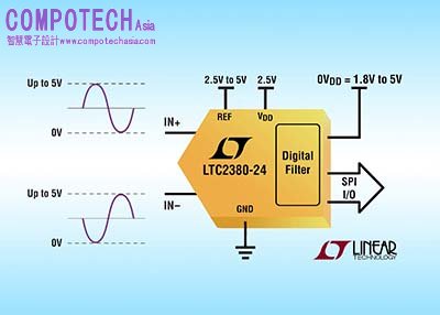 LTC2380-24使用晶片上的數位濾波器來平均轉換結果,去除了數位主機的處理負荷,並節省了數位資源和相關的功率。此外,LTC2380-24使相關的結果可透過低至2MHz之串列時脈讀出,因此可輕鬆連接微處理器,而能使用速度較慢的元件。LTC2380-24實現了真正的24位元雜訊性能並具有INL最大值為±3.5ppm 的高直流精度,且從單一2.5V電源只耗28mW。
