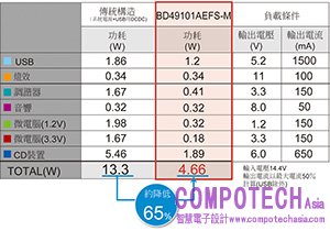 本製品的研發,活用ROHM半導體累積至今的汽車音響用系統電源獨家專業知識,成功做出以高效率DC/DC轉換器為中心的最佳電源系統。如此一來,將本公司傳統產品運作功耗從13.3W降到4.66W,成功減少65%。以汽車音響用系統電源IC來說,運作時所需功耗為業界最小。