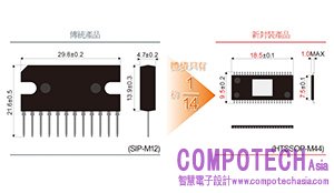 本產品重新設計DC/DC轉換器化和電源的構造,採用能抑制發熱,而且只需要基板,就可以散熱的表面安裝封裝元件(HTSSOP-A44)技術。由於不必設置散熱板,和本公司傳統產品相比,體積約只有1/14。能降低組裝製程數、在系統內精簡空間,並降低設計上的負擔。
