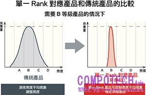 傳統產品須準備4個亮度Rank,再按照Rank來篩選晶片,但經由ROHM半導體自豪的一貫生產體制,從生產元件開始,即對每個細節高度要求,成功讓亮度穩定。亮度參差度只有傳統產品1/4,精度達到高水準,為業界極少數單一Rank供貨,大大解決各應用裝置亮度參差的問題。