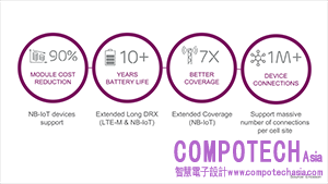 與現有的解決方案相比,NB-IoT可提供20 dB的優勢,因此這些新增功能將可進一步降低裝置成本、延長電池壽命至10年以上,並擴大覆蓋範圍。