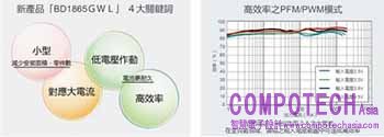 針對要求小型化・電池更耐久之行動裝置,「BD1865GWL」由於靈活運用了類比設計技術於電池放電時可以下限2.5V低電壓作動,因此能夠比一般下限2.7V的產品更加延長電池驅動時間。此外,亦搭載了PFM/PWM模式和ROHM獨家之Mixing PWM模式2個工作模式,當選擇PFM/PWM模式時在總負載領域將達成90%等級的高效率,而當選擇Mixing PWM模式時則適合音響等應用,可防止切換音﹙switching noise﹚所導致之惱人鳴響。加上一個1.6x1.6mm之小型IC即能對應最大2A之輸出電流,故對於應用上之小型化也有所貢獻。