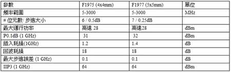 F1975和F1977 提供非常低的插入損耗和失真,其更高的功率處理效能,和其它競爭性產品相較,更具精確的衰減精度,讓客戶能獲得所需的效能,以實現系統更高的數據速率。Glitch-Free效能確保在MSB轉換過程中的低過衝和頻率振鈴,且75-歐姆的阻抗在目標應用上提供容易的整合。此外,F1977 是業界首創的單一矽片、75-歐姆Glitch-Free、和7-位元 DSA,使客戶能夠達成0.25dB的獲益控制,同時保持業界領先的RF效能。