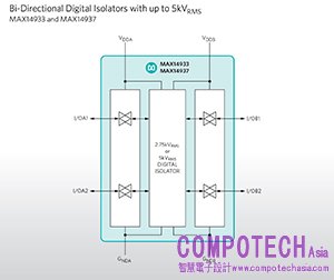 2016年6月2日--Maxim Integrated Products, Inc. (NASDAQ: MXIM)推出雙通道、雙向數位隔離器MAX14933和MAX14937,有效降低佔用空間,提高設計靈活性。器件能夠在電路之間雙向傳輸數位訊號,並且在兩個供電區域之間提供完備的電氣隔離,此外允許採用更少的元件,節省電路板空間。
