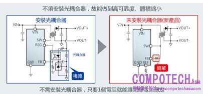 到目前為止,絕緣電源的控制零件由光耦合器等多個零件構成,但面臨到電路規模和經年變化等可靠度方面的課題,市場便要求能夠有所改善。