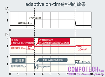 採用新研發的adaptive on-time控制後,和一般控制方式相比,輸出電壓變動200mV(負載電流1A,上升時間100µs時),降至65%以下,對於負載電流暫態變動,改善了負載響應特性,進而提升可靠度。