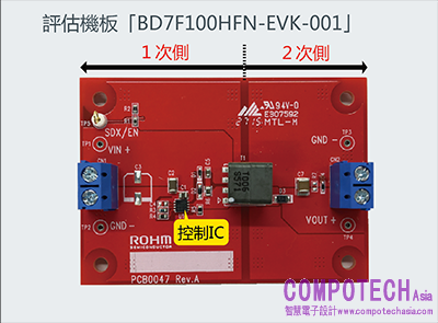 除了本系列產品外,網路商店亦開始販售代表性產品「BD7F100HFN-LB」的評估機板「BD7F100HFN-EVK-001」。配備BD7F100HFN-LB後,能輕易評估電壓24V 、輸出電壓5V、輸出電流800mA的絕緣電源。