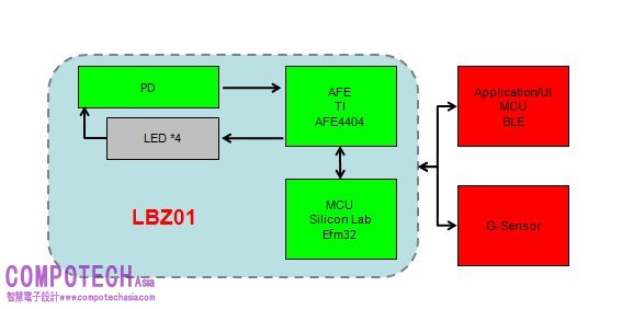 BEATZ PPG包含TI的AFE4404、Silicon Labs Efm32、4顆LED以及相應的接收光電二極體。