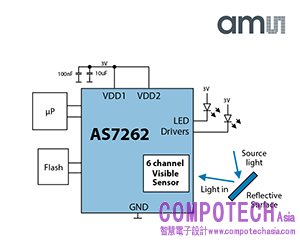 內建智慧的AS7262六通道可見光感測器透過I2C 或UART介面可提供校準的數位輸出。它能在可見光譜的六波長上測量光強度:450nm、500nm、550nm、570nm、600nm和650nm。AS7263可檢測近紅外光譜610nm、680nm、730nm、760nm、810nm和860nm的紅外特性。兩款產品都包含一個帶有LED驅動電路的電子快門,這意味著設備設計師可以通過單晶片準確地控制光源和光譜感測功能。
