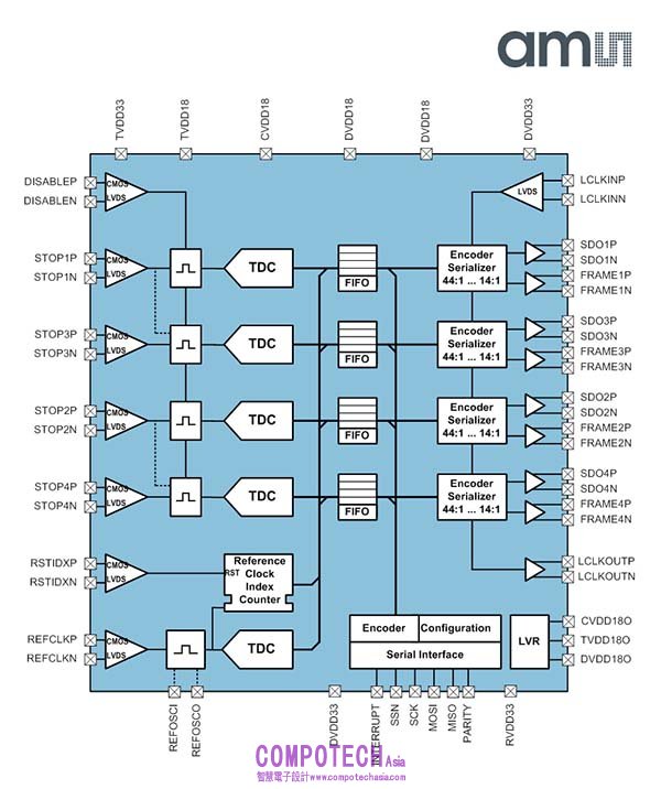 奧地利微電子的時間-數位轉換器系列能以高精確度測量短時間間隔,廣泛應用於雷射雷達(LIDAR)和鐳射測距設備,以及正電子發射醫療電腦斷層掃描和自動化測試設備中。TDC-GPX2的推出將使這些應用實現高達10ps解析度和新型高達每微秒70個採集樣本的高取樣速率。