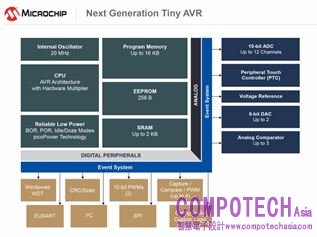 新MCU家族提供16 KB快閃記憶體、256 B EEPROM以及2 KB RAM,備有14接腳、20接腳和24接腳等不同的封裝選擇。這些元件同樣包含了其它tinyAVR MCU都有的重要功能,比如允許周邊無需借助中央處理器(CPU)即可進行通訊並使設計人員能夠針對特定應用進行客製化MCU配置的事件系統控制器。而內建的周邊觸控控制器(PTC)則簡化了電容式觸控系統的開發工作。其它整合的功能還有:20 MHz內部振盪器、支援USART、SPI和I2C的高速串列通訊、可配置客製化邏輯單元、帶有內部參考電壓的10位類比數位轉換器(ADC)、1.8 V至5.5 V的工作電壓、以及可將休眠電流降低至100 nA的picoPower®技術。
