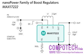 2017年3月14日--Maxim推出MAX17222 nanoPower boost (升壓調節器),具有業內最高效率和300nA最低靜態電流(IQ),為可穿戴及消費性IoT設計提供最小尺寸及最長電池壽命。MAX17222是一款輸入電壓範圍0.4V-5.5V,輸出電壓範圍1.8V-5V,輸入限流為500mA的升壓調節器,相比同類產品可減少多達50%的方案面積,同時提供95%的峰值效率,使發熱降到最低。MAX17222適用於各類可穿戴設備,據IDC預測將在2020年實現18.4%的年增長率(CAGR)。1