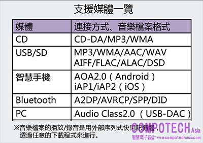 支援了以往的媒體(CD、USB、SD)到新的媒體(智慧手機、藍芽)、電腦(使用USB-DAC連接),音樂檔案格式從FLAC與DSD,涵蓋寬廣的格式。