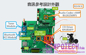 系統單晶片加入產品陣容後,是業界首次能可對應的高解析音訊參考設計。參考設計是以音訊系統單晶片為中心,加上ROHM的放大器與CD驅動器等所組成,將音訊設備與周邊應用的性能發揮到最大。此外也提供專用的軟體,能夠快速研發可穩定播放多種音源的音響設備,有助於確保音訊製作所需的時間。
