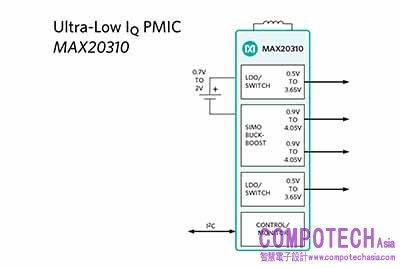 2017年3月30日--Maxim推出MAX20310超低靜態電流(IQ)電源管理積體電路(PMIC),支援原電池供電可穿戴式的健身產品設計,方案尺寸大幅減少50%,有效延長電池壽命。可穿戴式產品的PMIC需要支援最低0.7V的輸入電壓,適用於新型高能量密度電池架構,例如鋅空氣電池或氧化銀電池,以及越來越普及的鹼性電池架構。隨著個人及遠端監測需求的市場推動,減小方案尺寸、延長電池壽命成為至關重要的因素。例如,美國聯合市場研究機構(Allied Market Research)的一份報告顯示,預計全球遠端監護市場將達到17%的年均複合成長率(CAGR),2022年將達到21.3億美元的市場規模1。