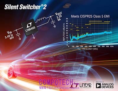 2017年4月14日--不久前收購凌力爾特 (Linear Technology Corporation) 的亞德諾半導體 (Analog Devices, Inc.,簡稱 ADI) 日前發表 6A、42V 輸入同步降壓開關穩壓器 LT8640S。其獨特的 Silent Switcher® 2 架構採用兩個內部輸入電容及內部 BST 和 INTVCC 電容,以將熱迴路面積縮減至最小。結合良好受控的開關邊沿和具有整體接地平面的內部構造,並採用銅柱以代替接合線,使LT8640S 的設計大幅降低了 EMI / EMC 輻射。更提升的 EMI / EMC 性能不易受到電路板佈局的影響,因而能簡化設計及降低風險,即使在使用兩層 PC 板時也不例外。LT8640S 於整個負載範圍內採用 2MHz 開關頻率,可輕鬆滿足汽車 CISPR25 Class 5 峰值 EMI 限制要求。另外,還可使用擴展頻譜頻率調變以進一步降低 EMI / EMC 輻射水準。