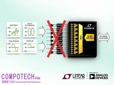 2017 年 4 月18 日--亞德諾半導體 (Analog Devices, Inc.,簡稱 ADI) 旗下的凌力爾特日前推出 18 位元8 通道同時採樣逐次漸近暫存器 (SAR) ADC LTC2358-18。該元件內建微微安培(picoamp)輸入緩衝器,在電路板空間有限的現狀下,LTC2358-18 透過去除通常在驅動非緩衝型開關電容器 ADC 輸入時所需的前端訊號處理電路,大幅節省了空間和成本。每個通道共省下 3 個放大器、6 個電阻和兩個電容元件,8 個通道總共可節省 88 個元件,從而節省了 BOM 成本和大量電路板空間,並使功耗降低超過 40%。微微安培輸入以及在 30VP-P 共模範圍內 128dB CMRR 使 LTC2358-18 能夠直接連接多種感測器,而不損害測量準確度。