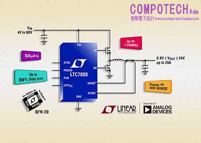 2017 年 6 月3 日 – 亞德諾半導體 (Analog Devices, Inc.,簡稱 ADI) 旗下的凌力爾特 (Linear Technology Corporation) 日前推出同步降壓 DC/DC 控制器 LTC7800,該元件以高達 2.25MHz 頻率運行以縮減電路尺寸和提高功率密度。 45ns 最短導通時間實現了 24VIN 至 3.3VOUT 轉換,同時以 2MHz 固定頻率切換,因而能避開包括 AM 無線電頻段等關鍵的雜訊敏感頻段。同步整流提供高達 95% 之效率,而高載模式(Burst Mode®) 操作於無負載備用情況下可保持靜態電流低於 50μA,因此非常適用於始終保持導通(always-on)系統。