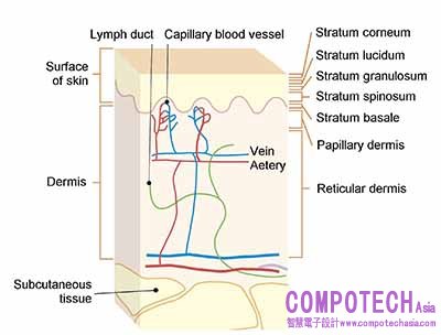 (右圖)人體皮膚的剖面圖。透過此新技術,可望判定真皮層血管的精確深度。