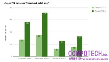 圖一: GoogLeNet 與ResNet-50採用Jetson TX2 Max-Q 與Max-P供電設定所達到的推論處理量。TensorRT 2.1在GoogLeNet與ResNet上提供兩倍的推論處理量。
