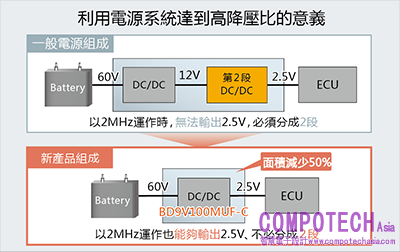 由於中度油電混合車的48V電源系統等,從高電壓切換至低電壓時,只需要“1個電源IC”,所以零件數量減半,有助於應用裝置小型化、系統簡略化,同時因可高頻運作,周邊零件也能選用體積較小零件(線圈等)。