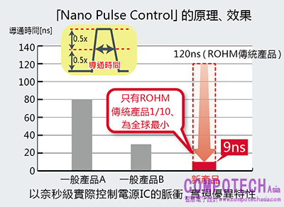 ROHM活用類比設計技術,以及功率製程等垂直整合型的生產體制,因應新市場對電源IC的需求,研發超高速脈衝控制技術「Nano Pulse Control」,成功實現“電源系統單晶片化”。
