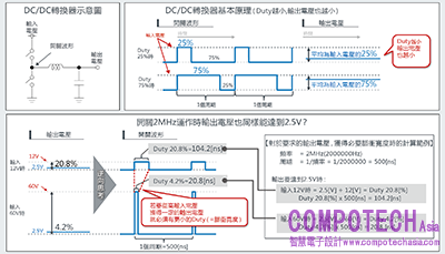 如此一來,就能以2MHz:不影響AM收音機頻段(1.84MHz Max.)下運作,並能以最高60V的高電壓輸入,產生ECU驅動的5V 和3.3V(最小2.5V)低電壓輸出。