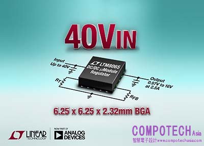 2017年10月03日--亞德諾半導體 (Analog Devices, Inc.,簡稱 ADI) 旗下的凌力爾特 (Linear Technology Corporation) 日前推出 µModule® (電源模組) 降壓穩壓器 LTM8065,該元件可接受高達 40V 的輸入電壓 (42V 絕對最大值),在具備雜訊的環境中可安全地操作於未穩壓或波動的 12V 至 36V 輸入電源範圍,雜訊環境包括工業機器人、測試和測量、醫療、工廠自動化和航空電子系統等。Silent Switcher® 架構可將 EMC/EMI 輻射降至最低,使 LTM8065 能滿足 CISPR 22 Class B 要求,以用於雜訊敏感的訊號處理應用,包括成像和 RF 系統。LTM8065 的小型 6.25mm x 6.25mm x 2.32mm BGA 封裝內包括了開關穩壓器控制器、電源開關、電感和其他支援性元件。僅需採用兩個 0805 大小的電容和兩個 0603 大小的電阻,LTM8065 的解決方案佔用面積大約為 100mm2,僅是具同等功率之模組式解決方案尺寸的一半。