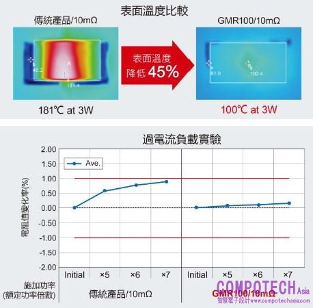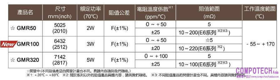 與先前的PSR系列,此次新開發的GMR100系列擴增了大阻值的5mΩ∼220mΩ產品,滿足客戶對大範圍電阻值的需求。
