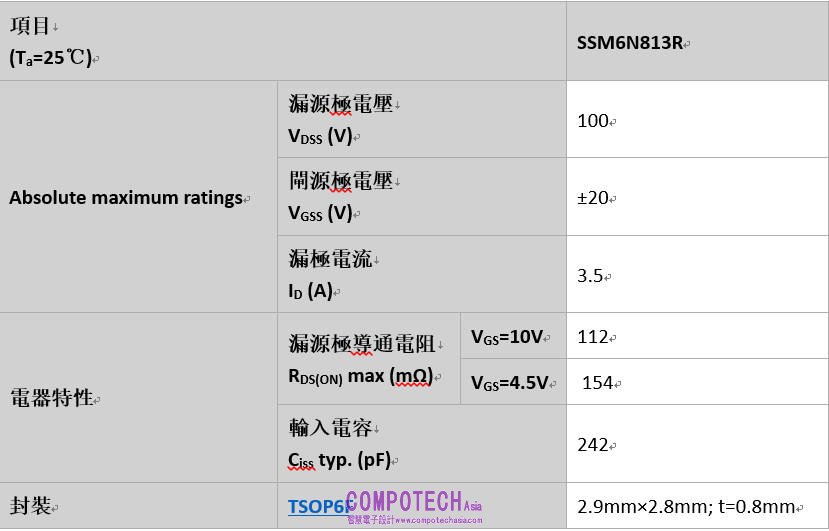 新IC – SSM6N13R擁有100V的最大漏源極電壓(VDSS)可確保並適用需要多個LED的車用頭燈產品,高靜電放電抗擾為此提供支援。此新產品採用最新製程,且為TSOP6F封裝(比SOP8封裝小70%),其具備1.5W的允許功耗及低導通電阻。