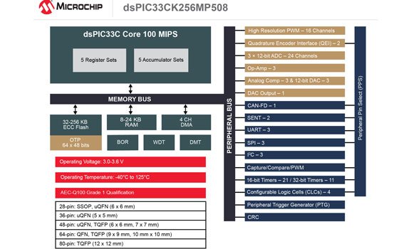 dsPIC33CK提供8種不同的封裝尺寸,從28到80接腳不等,最小封裝尺寸為5 x 5 mm。記憶體大小為32 到256 KB 快閃記憶體。