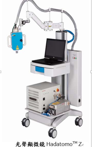 HadatomoTM Z 是一台移動方便、操作簡便的光聲顯微鏡,其活動機臂上崁有測量元件,並安裝在具有腳輪的系統本體上。全新 HadatomoTM Z突破了傳統單波長血管分析的侷限,可交替輻射出兩種不同波長的光聲波: HadatomoTM Z可依照血管內不同的含氧係數,區分出動脈和靜脈。當其交替輻射出兩種不同波長的光聲波後,動脈和靜脈將會顯現出不同的吸收係數,然後便可利用這些吸收系數,來計算出血氧濃度。