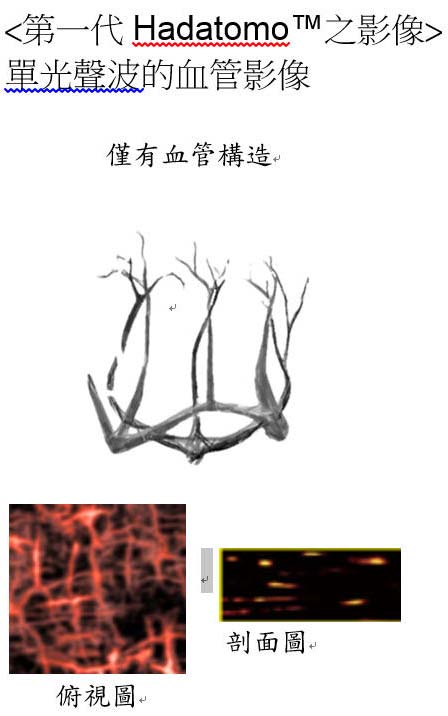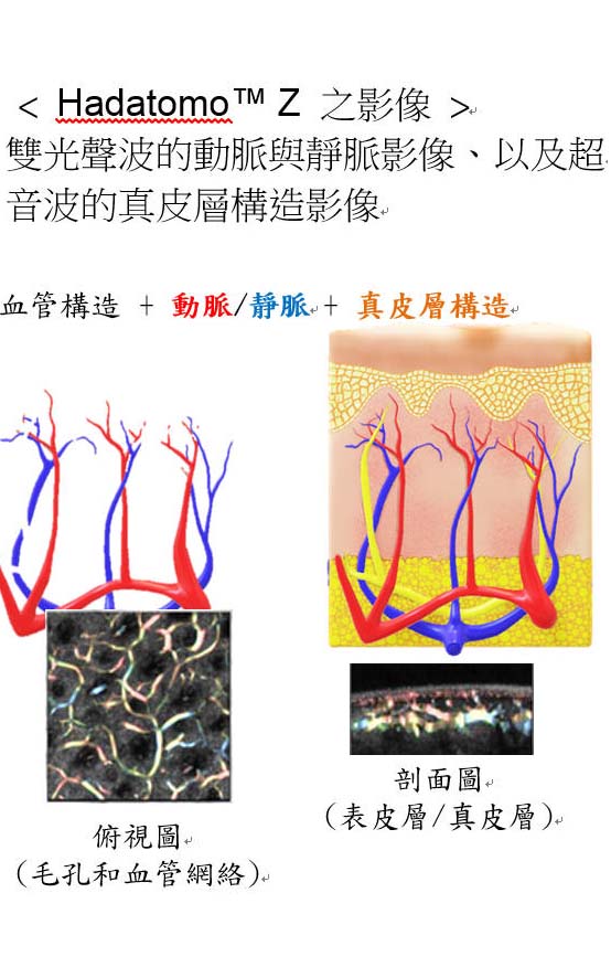 超音波測量方法相當適合用在表皮層/真皮層的分析上,因為其還能顯現出肌膚凹凸不平、或毛孔、皮脂腺等問題。HadatomoTM Z 會同步進行超音波測量和光聲波測量,然後將光聲波所取得的血管構造影像、以及超音波所取得的真皮層構造影像層疊; 因此,能以3D成像的方式,正確顯現出血管位置,其深度可達真皮層內3mm。