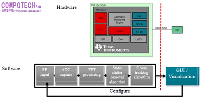 在人數統計方案中,IWR1642可管理所有用來追蹤和統計的軟體。無需外部處理器,僅需一台電腦即可操作視覺化和圖像使用介面(GUI)。