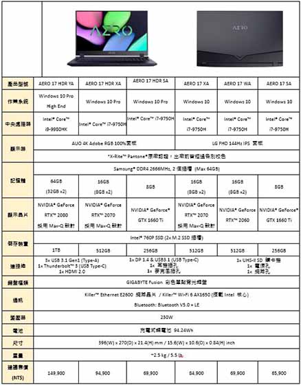 技嘉AERO系列創作者筆電包含15.6吋極輕薄AERO 15 Classic經典款筆電、搭配Samsung AMOLED的AERO 15 OLED (消光黑、冰晶銀) 以及最新推出的17.3吋AERO 17 HDR,結合高行動力與強運算力,搭配不同零組件及面板配置,將帶給專業工作者更多高品質的選擇。