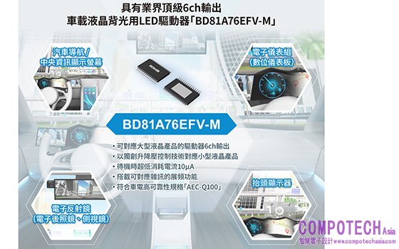 半導體製造商ROHM(總公司:日本國京都市)針對汽車導航系統、汽車中央資訊顯示系統、汽車儀錶板等,研發出液晶背光用LED 驅動器IC「BD81A76EFV-M」。