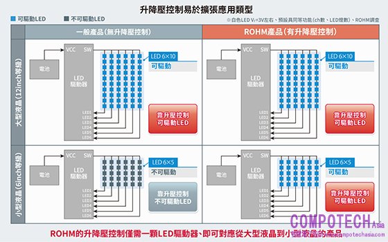 1. 採用ROHM獨創的升降壓控制技術,僅1顆即可驅動小型~大型面板