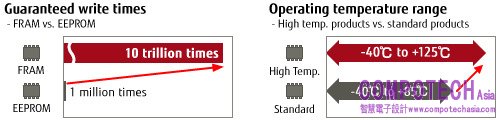 這款擁有2 Mbit密度的產品採用SPI介面,支援從1.8伏特至3.6伏特的廣泛電壓範圍,且運作耐熱度可高達攝氏125度;即使在這樣的高溫環境也能保證10兆次的讀∕寫次數,相當於EEPROM的一千萬倍,而最高運作頻率則達到50 MHz,比現有產品快1.5倍。此外,這些產品的可靠度測試符合AEC-Q100 Grade 1標準,達到被稱為「汽車級」產品的認證標準。