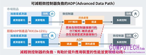 這二款產品皆非常適合運用在工控裝置之馬達振動分析等機器健康監測的三軸加速度感測器。搭載獨創的Advanced Data Path(以下簡稱ADP),可在加速度感測器端,先處理過去需在微控制器端才能進行的訊號處理和雜訊過濾,因此有助於減輕微控制器的負擔,降低應用功耗並提高應用性能。另外針對工控裝置,可進行感測頻段高達8,500Hz、加速度高達±64g 的高加速度振動檢測,且工作溫度範圍也可提高至105℃,感測器本身的消耗電流更是不到Kionix 以往產品的一半(低功耗模式時僅0.67µA)。此外也配備了Wake Up 功能和Back to Sleep 功能,有助於進一步降低功耗,並支援穿戴式裝置等以電池驅動的感測裝置。