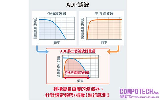 ADP 是一種取代微控制器過濾功能的 Kionix 獨創新功能。具體而言,是由內建於感測器的多個可客製化頻率濾波器,組成具有高度靈活性的濾波器,進而消除不必要的雜訊,只篩選出所需的訊號。另外,由於每個濾波器均可ON/OFF 切換,因此能夠彈性運用。以往在微控制器端進行的部份,包括感測器訊號FFT 分析等在內的頻率分析和雜訊過濾功能,將能夠在加速度感測器端進行,因此可靈活地傳輸所需資料,減輕微控制器的負擔,降低功耗並提高應用性能。