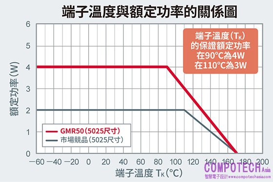 GMR50儘管是5.0×2.5mm 的小型尺寸,卻具有出色的散熱性,能在端子溫度TK=90℃時保有4W 高額定功率,在端子溫度TK=110℃時也能確保3W 的額定功率。